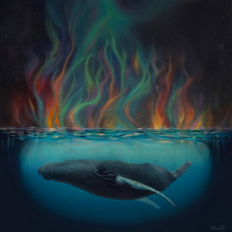 This original acrylic painting was created onto a deep edge, stretched canvas. The background colour wraps around all edges. If I had a magic wand and could make two natural wonders of the world appear both at the same time, this would be it; Aurora Borealis, Bioluminescence, and yes must have a w...