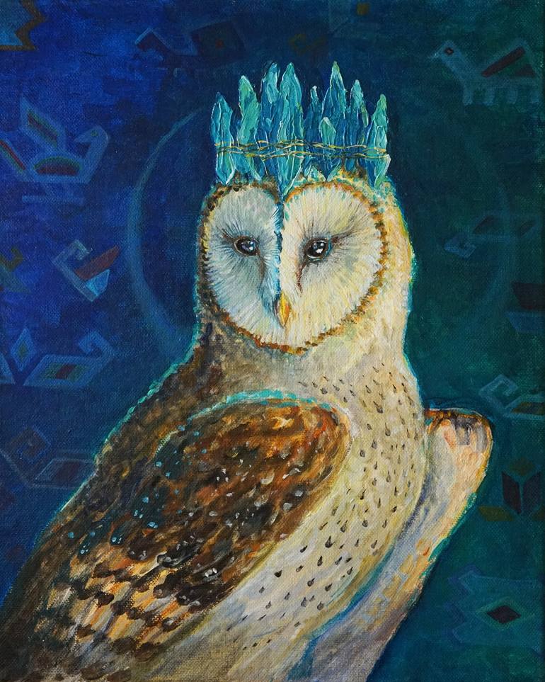 A majestic bird, lord of dreams, an illustration for an ancient legend. Acrylic on canvas, palette knife, and brush. Painting with ancient symbols of birds and animals. Acrylic on canvas 30 x 40cm 11.6 X 15.7 inches