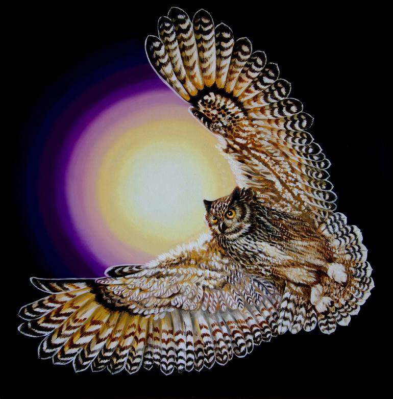 The picture is painted in oil on canvas, the canvas is stretched on a wooden sub-frame. The picture is framed in a wooden frame. I really like owls. They are special. Once I saw an owl flying at night. There was an unusual moon in the sky, it had a multi-colored radiance. It impressed me. And I dec...