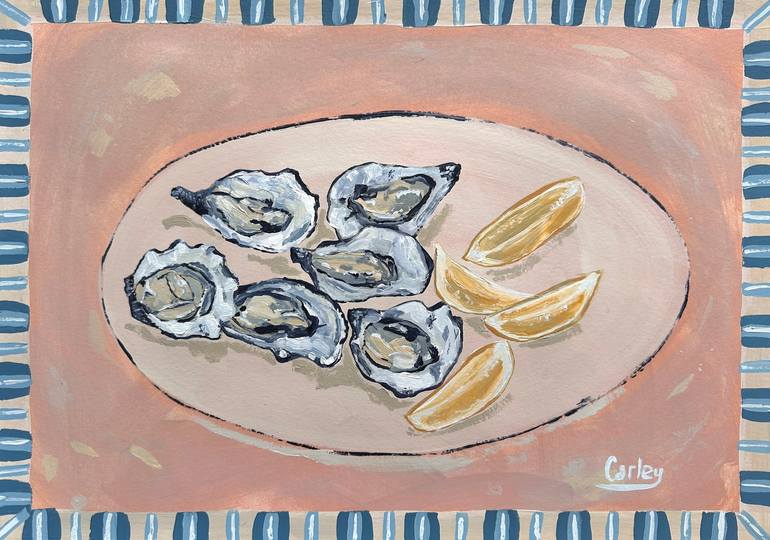 ' Oysters in the Bay ' is from my new original paintings on Paper 'The Med Collection' taking inspiration from the Mediterranean/coast. This small collection has a slightly rustic charm, with a muted soft palette from the ocean and pastures.. Impressions or inspiration from nature, seafood and homes...