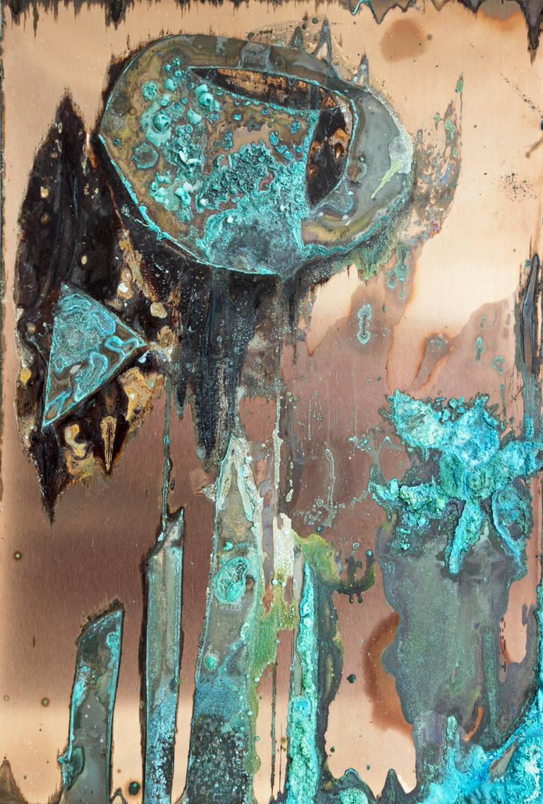 NO BRUSH. NO CANVAS. NOT EVEN PAINT. I have developed an art technique of my own. My originals are created on sheet metal like copper, bras and aluminum by applying organic substances as salt and vinegar to the surface. This starts chemical reactions. Resulting in fantastic colours and shapes that ...