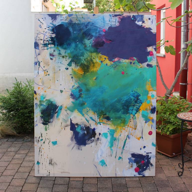 "Powerful, dynamic, and full of energy. With an intense vibrancy that touches and moves the viewer directly – that’s how I would describe my paintings in two sentences. My work is an expression of vitality and inner strength. It thrives on contrasts and tension: The viewer enters a dynamic interplay of chaos and order, impulse and control, lightness and depth. As an artist, my goal is to release energy and spark impulses in the viewer that extend beyond the canvas. Through the visual power of my work, a space emerges where perception and emotion connect: The viewer responds not only rationally, but emotionally. The energy, dynamism, and expression of the paintings immediately engage the viewer and unfold their impact – both in the surrounding space and within. Artistic creation is, for me, a space of freedom and expression – a place where I follow my intuition and give shape to imagination. It fulfills me to create something new, unique works that have never existed before. Painting is a vibrant, creative process that continually challenges, inspires, and excites me. I usually begin spontaneously – from a mood, an impulse, or the desire to work with a specific color or technique. In dialogue with the painting, a story begins to unfold – shaped by the works expression, form, and the emotions it evokes. External influences also flow into this process: personal themes, social trends, current affairs – all of it is interconnected. With my titles, I try to capture this story without limiting the viewer’s freedom of interpretation. On the technical side, I explore contrasts and bring them into dialogue: color meets non-color, line meets area, light meets darkness, emptiness meets fullness. These fields of tension are my experimental ground. I often work in large formats because I need space – space for movement, for energy, for the unpredictable. Every brushstroke is a decision, every moment an impulse. It is an intense, physical process in which I surrender to the flow while consciously shaping it. Although my works are abstract, they evoke associations. Some recall nature, landscapes, or the sea – places that ground us and help us reconnect with ourselves, places essential to our being. Others suggest emotional spaces tied to feelings like safety, love, or comfort. My paintings do not depict but suggest – creating and leaving room for personal associations.
