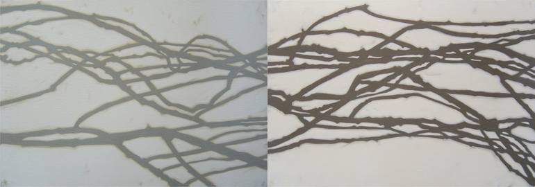 this diptych of dormant vine branches, hung horizontally as shown with the panels touching, depicts two sets of juxtaposed branches. one panel has grey branches & the other has brown; both are against slightly different colored white backgrounds.