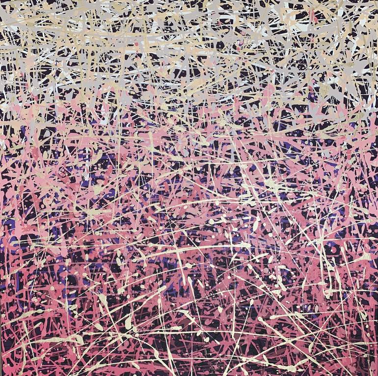 Abstract painting inspired in Jackson Pollock. Different kinds of lines in pink tones with dripping technique
