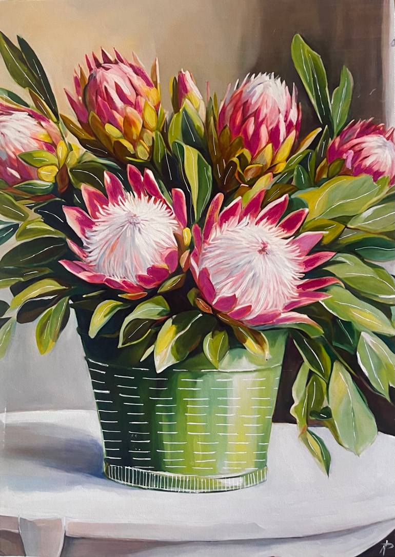 Beautiful bunch of Pink Proteas in a pretty Apple green bucket, on a White table near a White window.
