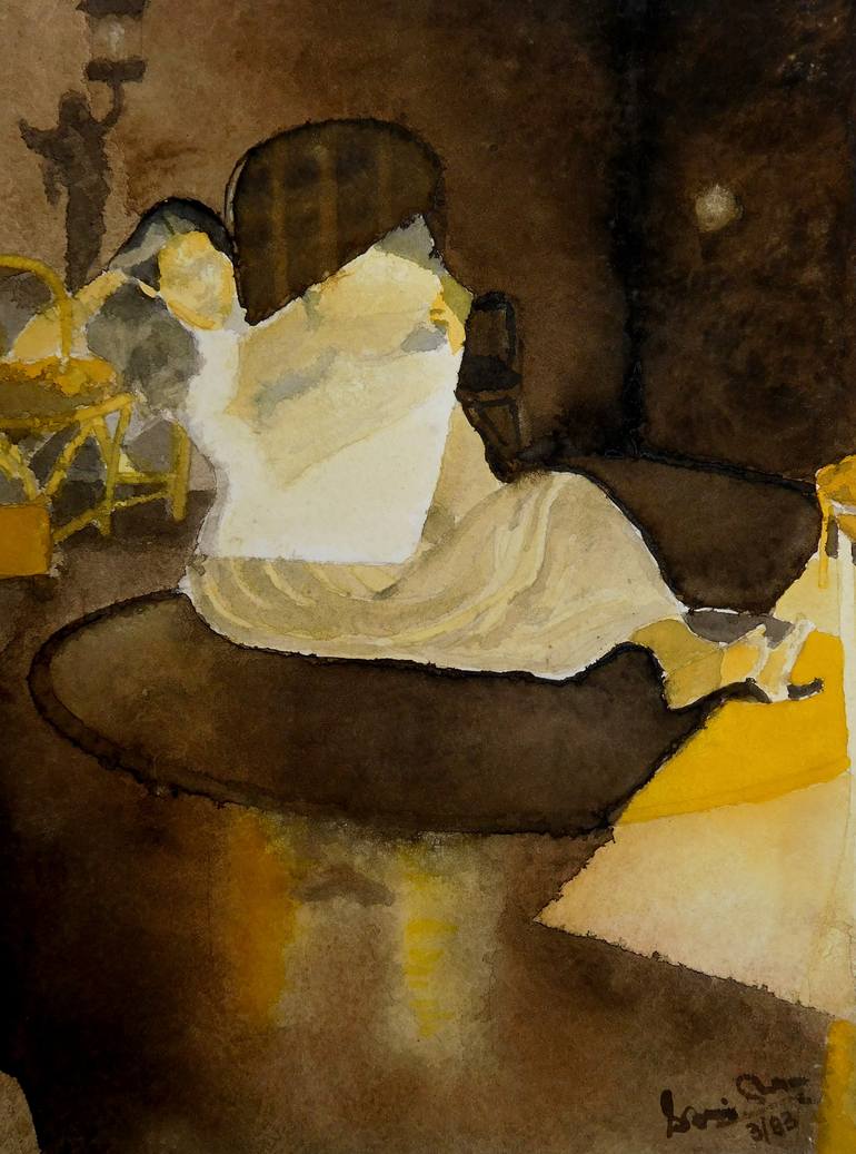 This composition is created by the morning sun creeping into the room, lighting up the lady on a floor mat reading the morning newspaper with prop like furniture pieces in the background. The predominant colors are yellows and browns with whites of the paper showing and adding the sheen.