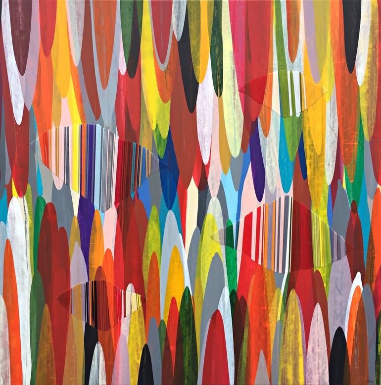 Barcelona - Catalunya (1964) Many painters create texture upon their canvases by building layer upon layer of paint; with each layer comes a greater sense of history and dimension within the work. Others using thickening agents to almost sculpt their paint, spreading it thickly upon their work’s surface for a subtle 3D effect. Artist Raul de la Torre has chosen a unique route to enrich his acrylic paintings with texture: embroidery. An abstract textile artist, de la Torre first chooses the colors he wishes to incorporate in the palette of the work he is about to embark upon. To him, the colors represent people, moments or feelings. He paints with acrylic in various blocks of color interacting with one another, evolving a pattern upon his canvas. Sometimes he contains his paint within a clean border, other times he lets his blocks of color drip down the canvas or paper. Next, the artist begins his process of embroidery. De la Torre makes horizontal cuts on the canvas or paper and covers these open areas using cotton thread. This process of embroidering on canvas or paper adds both intrigue and a sense of depth to each unique work. De la Torre’s most recent body of works reflects a series of poems by a well known poet from Catalonia, de la Torre’s home country. An homage to both the poet and the creative process, de la Torre’s technique of embroidery is heart felt exploration. Just as a poet builds words to form metaphor or meaning, the artist builds texture through embroidery to form depth and character