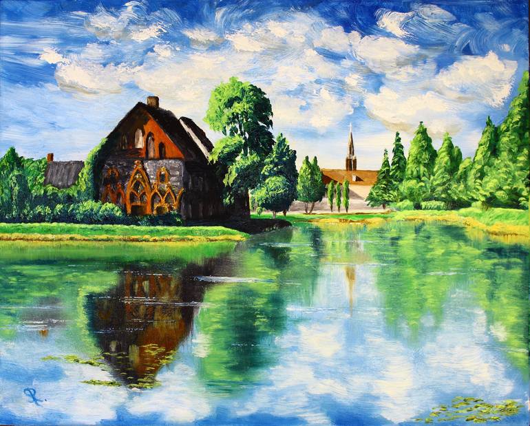 The painting conveys the tranquility of an idyllic nature reflected in a crystal clear lake. In the foreground is a majestic building with gothic windows, surrounded by lush green trees. The combination of deep red and brown tones on the facade contrasts with the blue and green tones of the water. T...