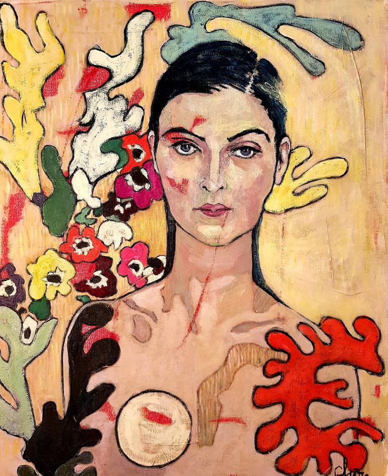 Poppy is the portrait of a dark haired woman lost in a dream. The painting has various patterns and illustrative imagery of poppy’s in the background. Her mood is defiant, her attitude is inquisitive yet the main scope is to exude mystery. She is enveloped by flowers, coral and colors that are very ...