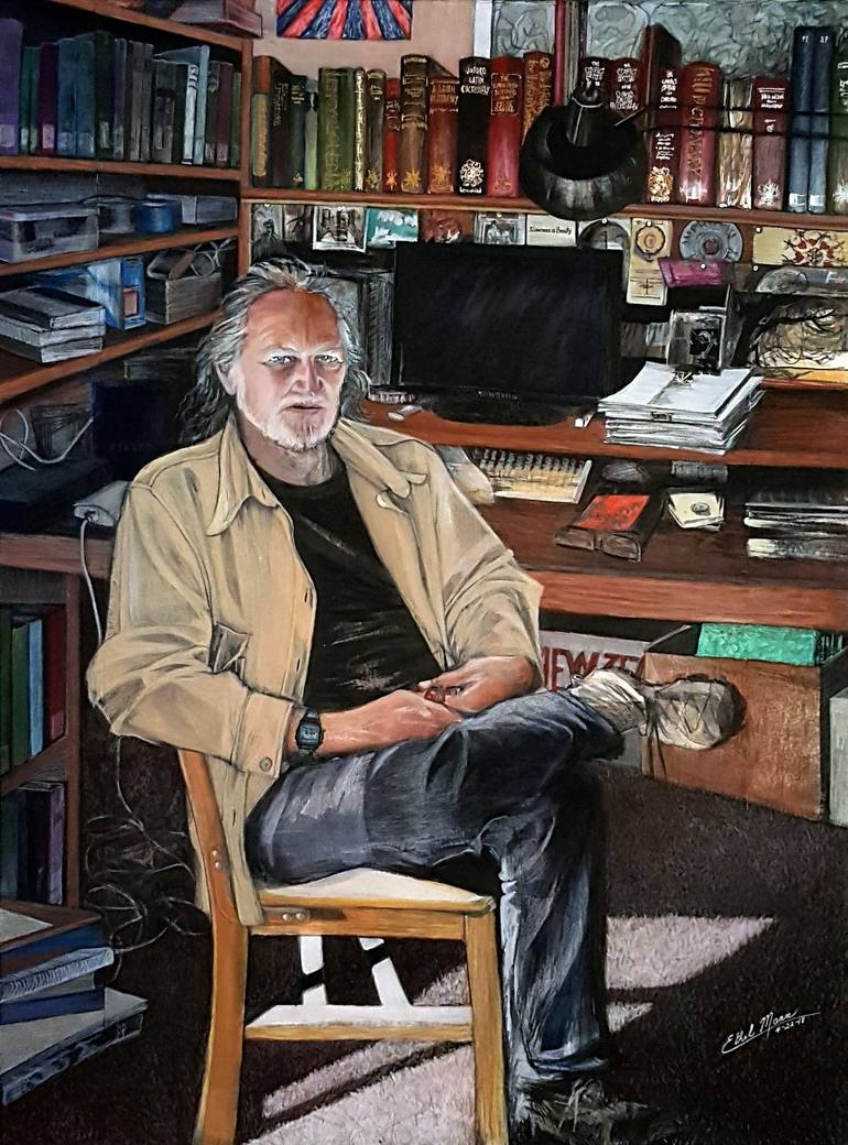 Well known Berkeley poet, Jim Powell, is a lifelong friend of the artist. Working from various photos the artist shot herself, the image is a composite view of the poet from 2009 until the present. He is picture in his longtime, Berkeley, California writing studio/home. Jim Powell is the author o...