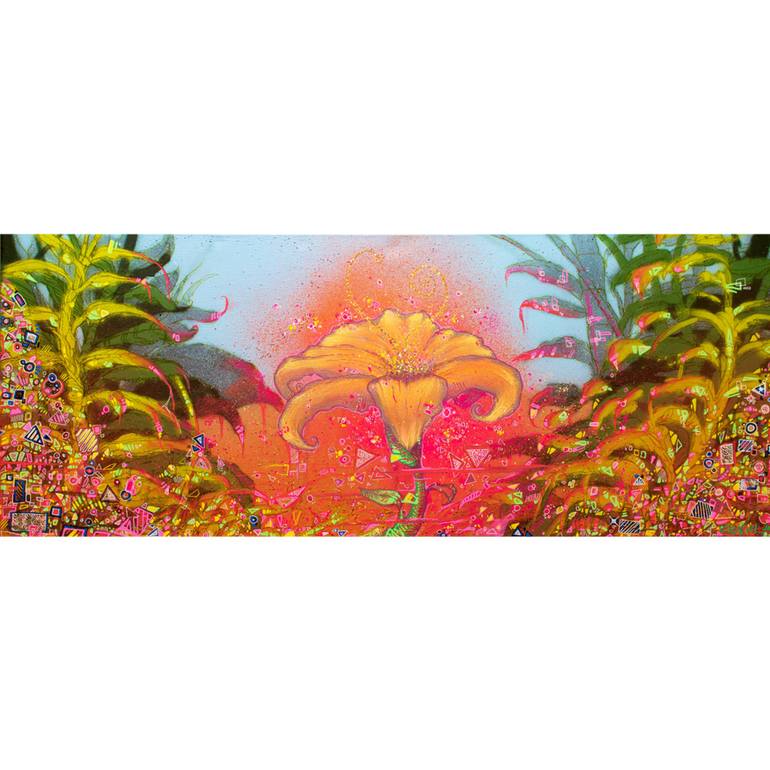 It is a landscape with a futuristic scene painted, where only the memory of the flowers will remain through holograms and virtual images. There are some errors in transmission of the bytes, so the inevitable glitch is present too.