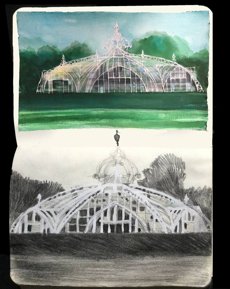 Plantentuin Meise ( Bruxelles) Sketching in Situ "Boceto del Pabellon del arq.Alphonse Balat"(1854) Watercolor op paper and Sketch Libreta Moleskin + Acuarela(57x38cm) 2020