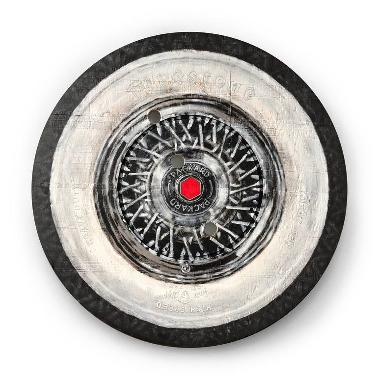 painted this Packard tire with the giant white walls on a discarded cable spool I found in a recycling area. Also made an 8 ball painting from the same discarded spool.