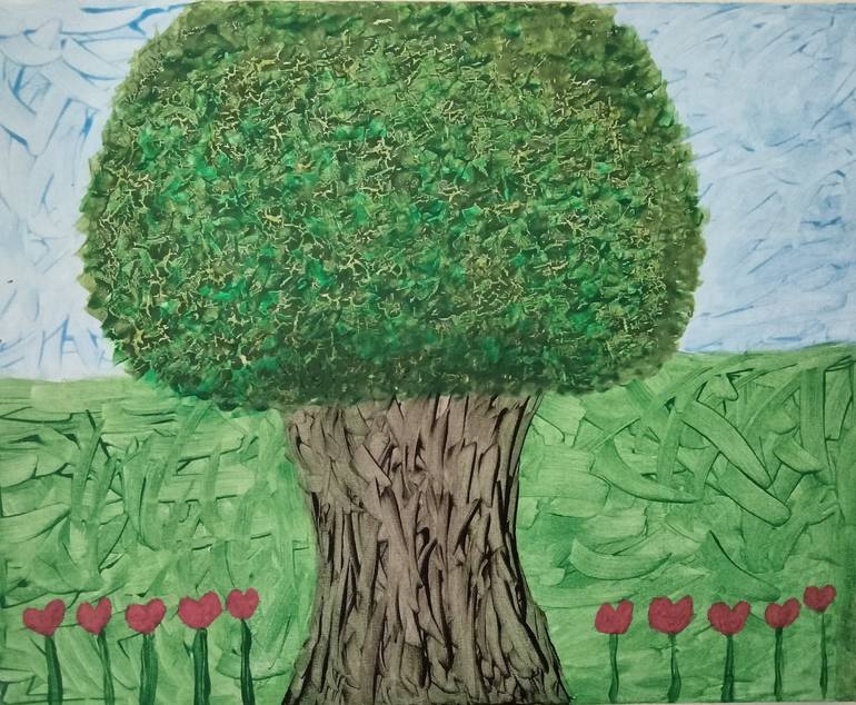 I love trees and this was my first painting since I began painting again in life. Best it be a tree! I also love flowers and nature in general. This is what came out of my heart.