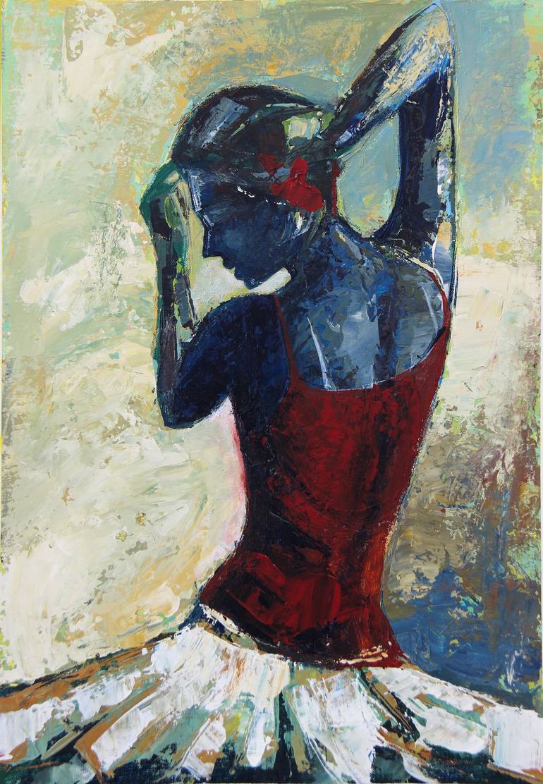 Painting of a dancing girl-Scarlet Jones is inspired by a personal experience. While walking down a street in Paris, the artist's eye caught sight of a ballerina in a red tutu dress. The crowd cheered in appreciation of her performance, and the emotions she displayed seemed genuine. This original a...