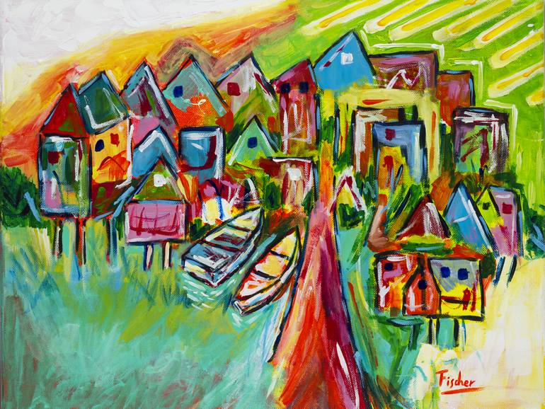 Una pintura inspirada en los paisajes del sur de Chile. A través de una atmósfera colorida represento la riqueza de esta tierra. Las casas flotantes, llamadas también palafitos, están dispuestas de manera entrelazada y contigua, simbolizando el contacto humano y la cercanía del pueblo chilote. Las l...