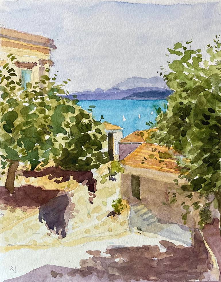 Plein air watercolour looking South to Levkas, Meganisi, Ithaca and Kefalonia. Heaven.