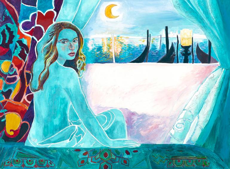 Female nude painted in blue, is sitting in a Venetian interior overlooking the canal with gondoliers in there boats. She looks senuously at the viewer.
