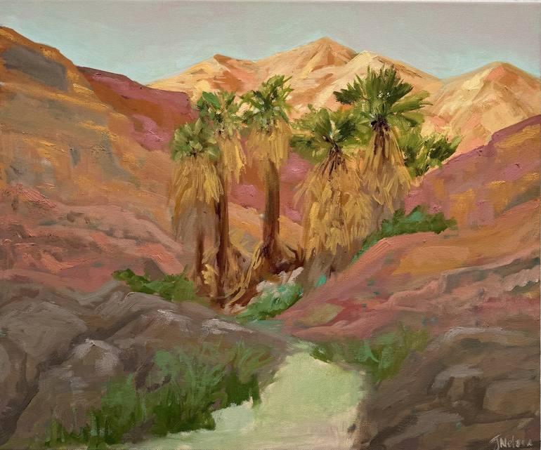 Palm Friends showcases a collection of palm trees we discovered in a hidden oasis. With their lush, green fronds tucked between layers of multicolored rocky hills and hidden from the harsh desert sun, this was a beautiful respite on a warm hike. Oil on canvas.