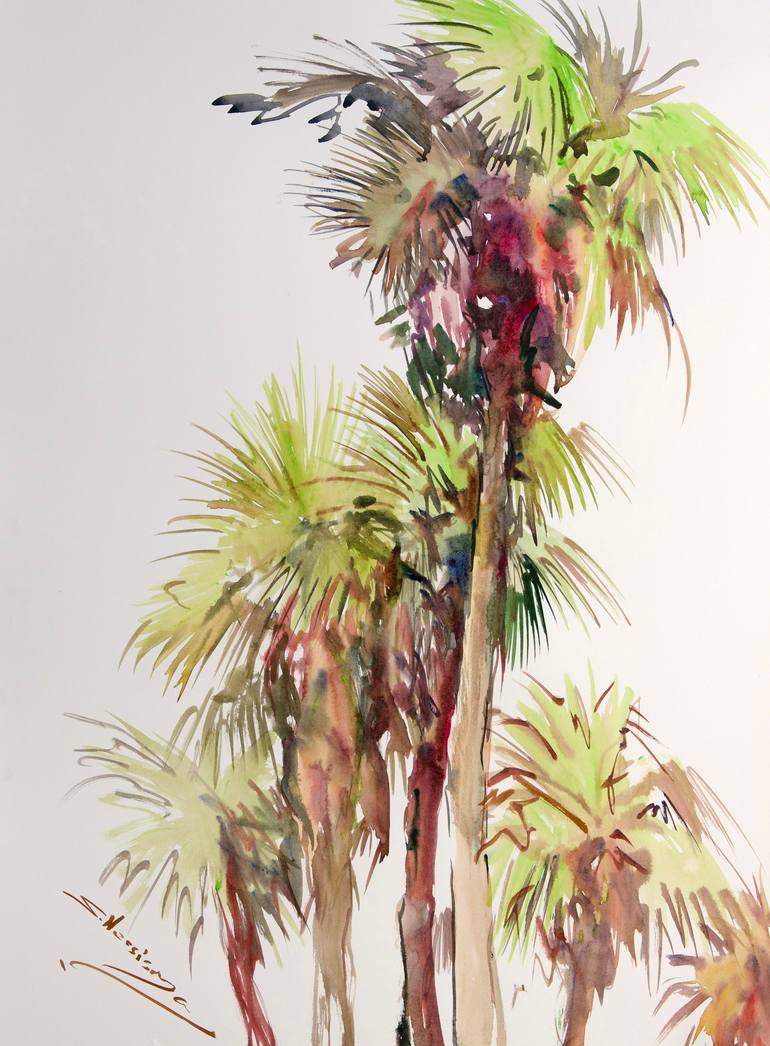 Beautiful elegant shapes of Palm Trees from the beach of California on a white background create a vibe of positive tropical mood. The artwork is on hot-pressed, 100% cotton made watercolor paper and I use only the finest quality watercolors. That means the painting will not fade stay under any brig...