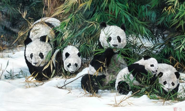 “Panda Family in Winter's Embrace" by J. Woko Signature: Hand signed by artist Certificate of Autheticity: Included Let us know if you would like to see more photos of this artwork! Request for additional photos: - Email ()