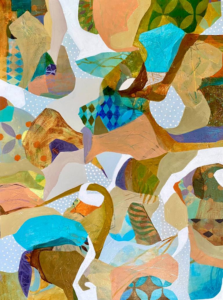 This large-scale abstract invites the viewer into a layered landscape of movement, light, & quiet energy. Organic shapes drift across the canvas, interwoven with translucent washes, soft geometry, and moments of playful pattern. The palette—sun-warmed neutrals balanced with turquoise, teal, and moss...