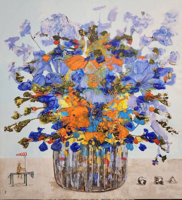 I depicted a bouquet of bright paper flowers. They symbolize the lightness of being. Next to the bouquet of flowers there is a small wooden horse, with a wooden man sitting on it holding a windsock in his hand. I called it the wind catcher of good luck. On the other side lie geometric figures, a sym...