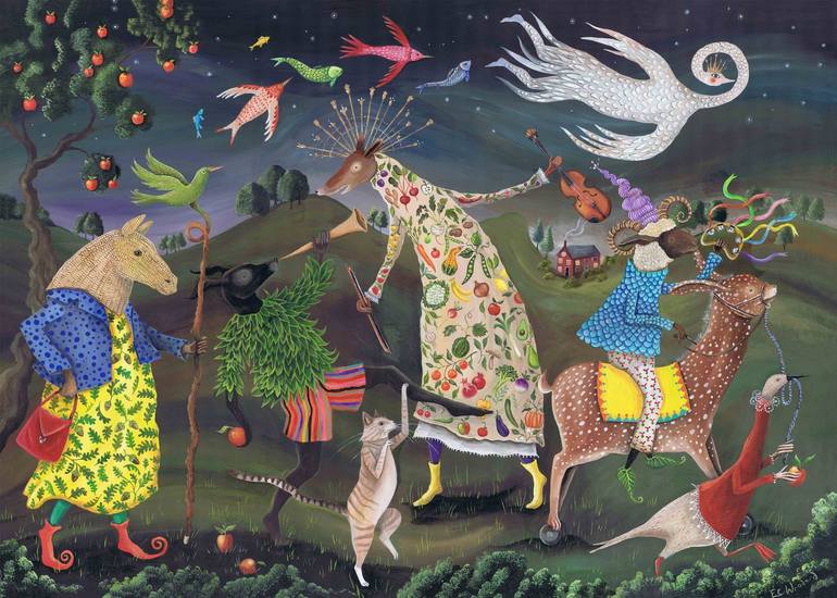 'Parade To The Solstice' captures a lively and festive procession of entertainers joyfully making their way to or from solstice celebrations. The solstice is inherently associated with joy, revelry, cheer, and the cyclical transition of the seasons. I have aimed to convey this sense of jubilation th...