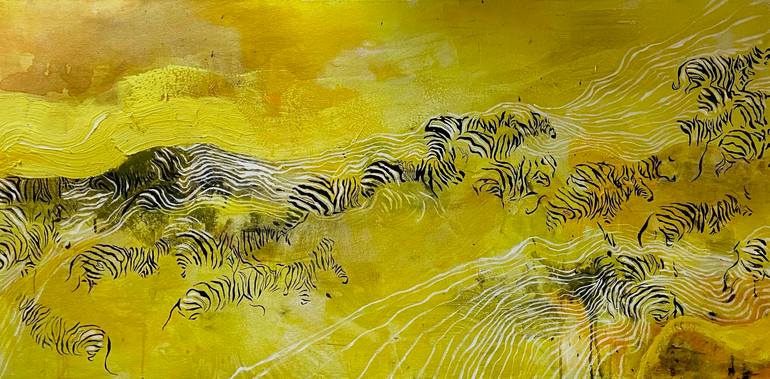 This painting is a unique abstraction that captures the movement and unity of nature. The lines, reminiscent of zebra stripes, intertwine with textured yellow brushstrokes, creating an illusion of motion and harmony. The work symbolizes a herd moving together, following instinct and the forces of na...