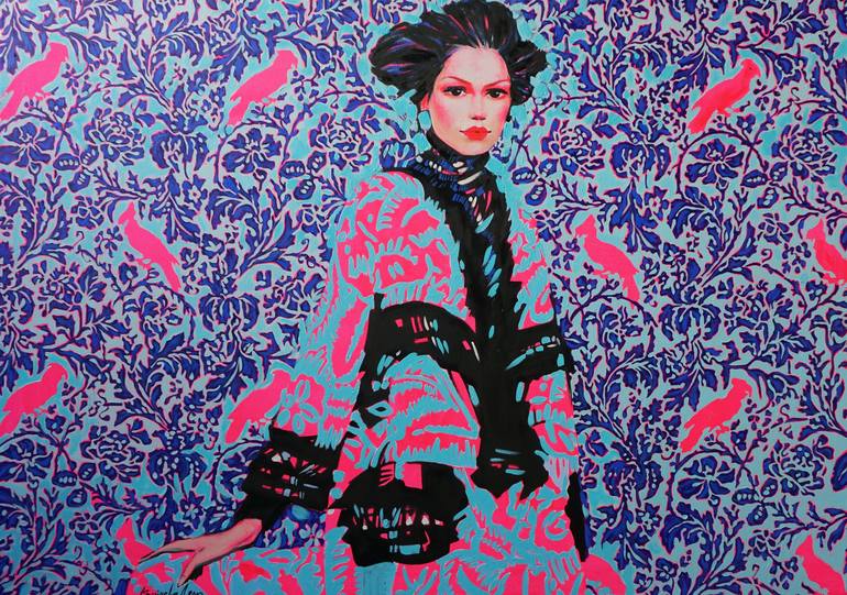 Paradise bird. Gentle, shy, elusive beauty. Delicate blue, delicate turquoise. Frost paints paradise flowers with ultramarine. Bright pink birds in harmony with the pink ornament of the dress and the pink blush on the cheeks of a magnificent bird of paradise with pale skin and a bewitching look. Mod...