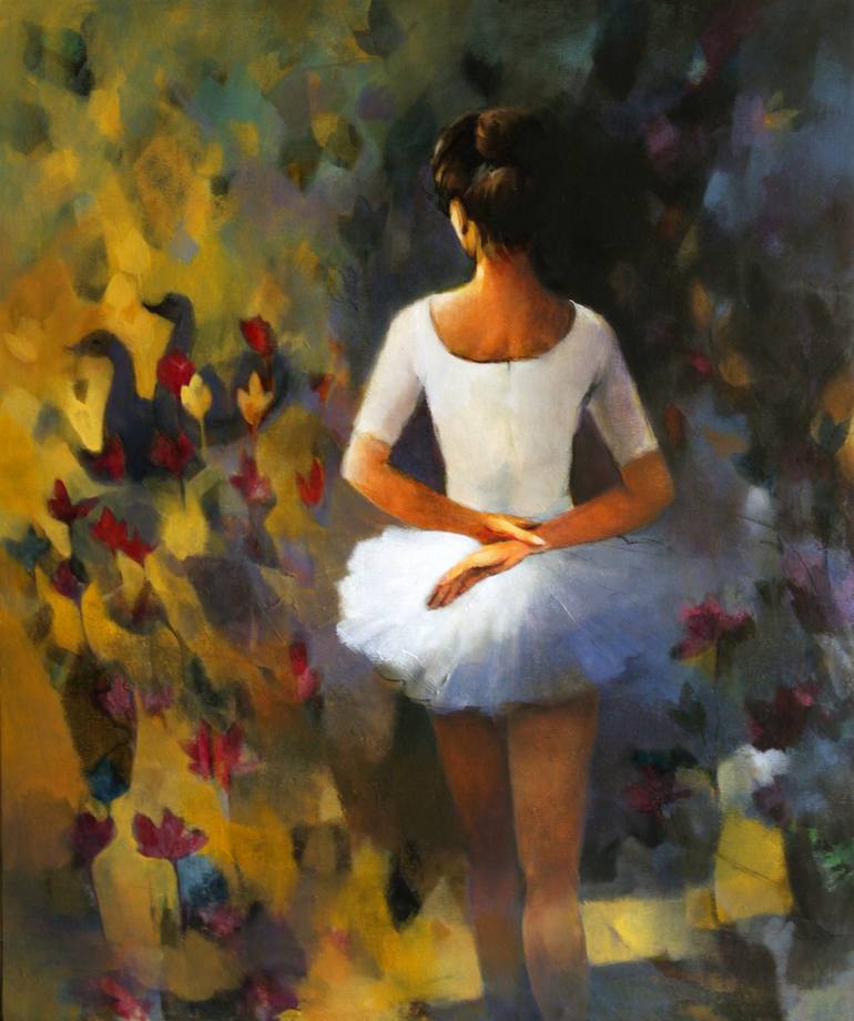 Dancer against an abstract background. Imagining to achieve new horizon.