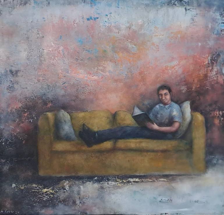 In continuing my most recent series, I chose a man reading on a sofa, relaxing and enjoying the peace of solitude, away from the maddening crowds. Once again, the difference between private and public space.
