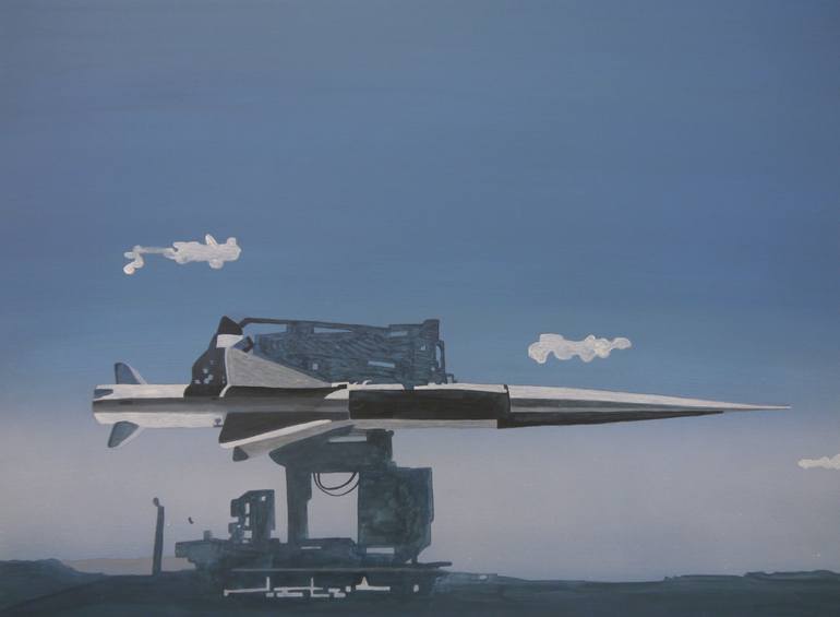 Painting, acrylic on reclaimed wood, varnish, ready to hung. Image still taken from a found video of military testing in Sardinia. My work explores everyday activities, identity and personal history.