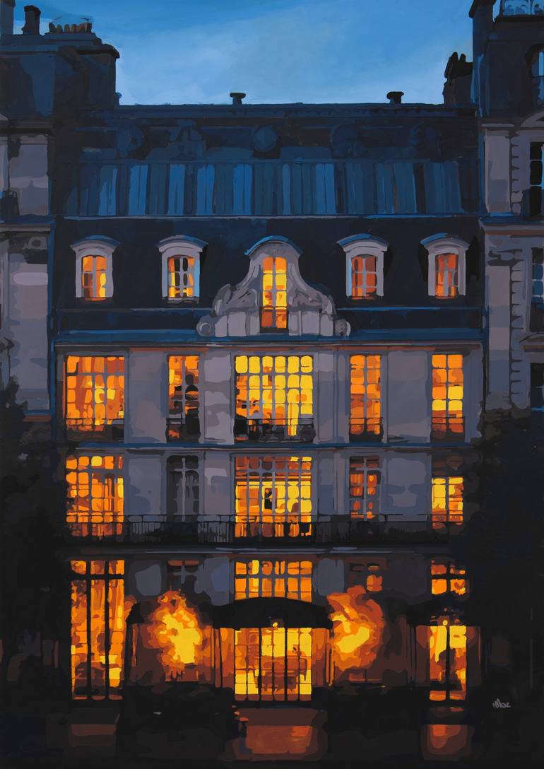 The realistic acrylic painting on canvas captures the magical atmosphere of a typical Parisian facade at dusk. The scene unfolds on a tranquil street, where the facade of a building stands imposingly beyond. The windows of the facade stand out sharply against the background, each emitting a soft y...