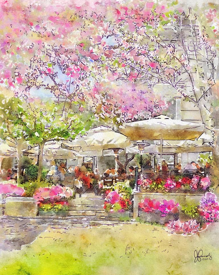 Vertical Format: This joyful yet relaxing Parisian courtyard cafe is brought to life with beautiful pink, red and purple flowers, and lush, green trees as springtime arrives in Paris, France. Artwork by artist Jennifer Berdy.