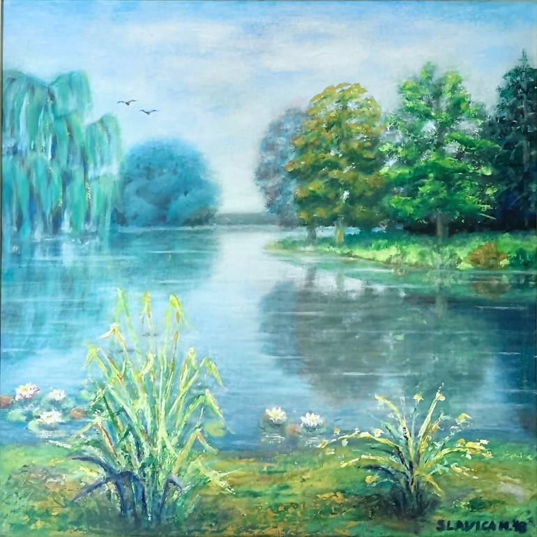 "Park in Breda, Netherlands," is an original oil painting on canvas. This beautiful artwork combines realism with impressionistic touches to depict a summer day lush park scene, complete with verdant trees and the tranquil reflection of water. The artist masterfully blends colors and textures using ...