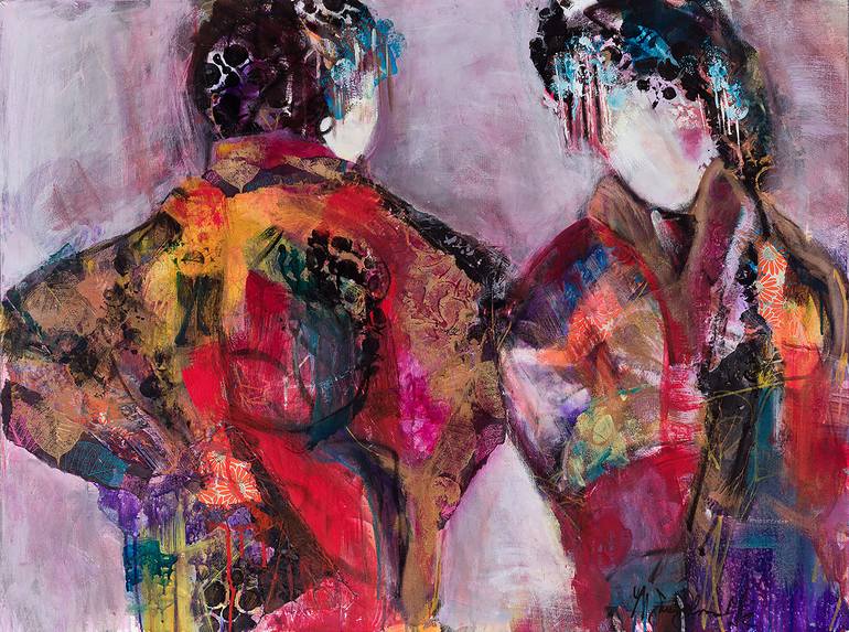 My love of art started at an early age from painting in oil and drawing. For many years I worked in oil painting landscapes before I discovered my love of mixed media abstracts in a workshop. My work is now process driven, mixed media paintings that are built as much as painted. I start with a loose layer of color in acrylic, add texture, add collage, draw into the work and then repeat that process over and over. I allow the layers to build and reveal images to me directing me where to go with the painting. The images are either abstract, figurative or floral but they are all created in exactly the same process. When a painting is complete it has somewhere between 25 to 40 layers of paint, and collage. As the surface builds I will take photos of the work, studying the value changes and also finding what story the canvas is trying to reveal. Once the image is starting to emerge it is my job to hone the many layers of texture, color, and pattern into one cohesive painting. I want my viewer to be pulled into the painting to see the depth and complexity but also to step back and enjoy the final image as well. For paintings like my geisha series, each piece has many layers of collage and drawing making the underlying image very intricate. I keep the over all figure confined to a more simplistic background allowing for the focus to rest on the beautiful kimono. I participate in various shows and art fairs in the area. My work is held in private and corporate collections.