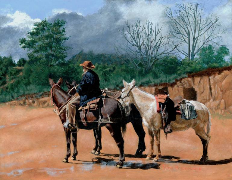 The inspiration for this painting came from a visit to the South Rim of the Grand Canyon. We wondered over to the paddocks where they saddle and organize the animals for the trail ride. He was waiting to bring up the rear with the spare mules. The scene had a zen quality to it. I painted it in acryl...