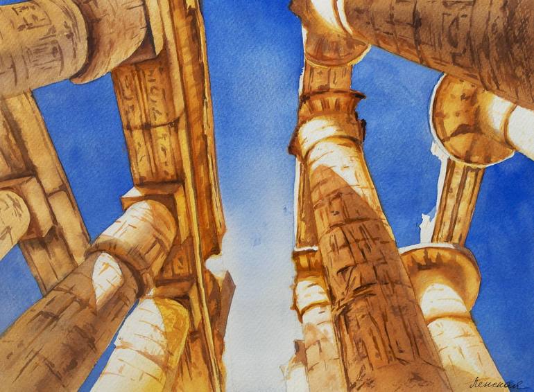 Karnak open air museum is one of the most visited historical sites and monuments in Egypt. These are columns of the Great Hypostyle Hall dedicated to Amun-Re, Ancient Egyptian god of Sun. Made on 100% cotton paper Saunders Waterford, Rough