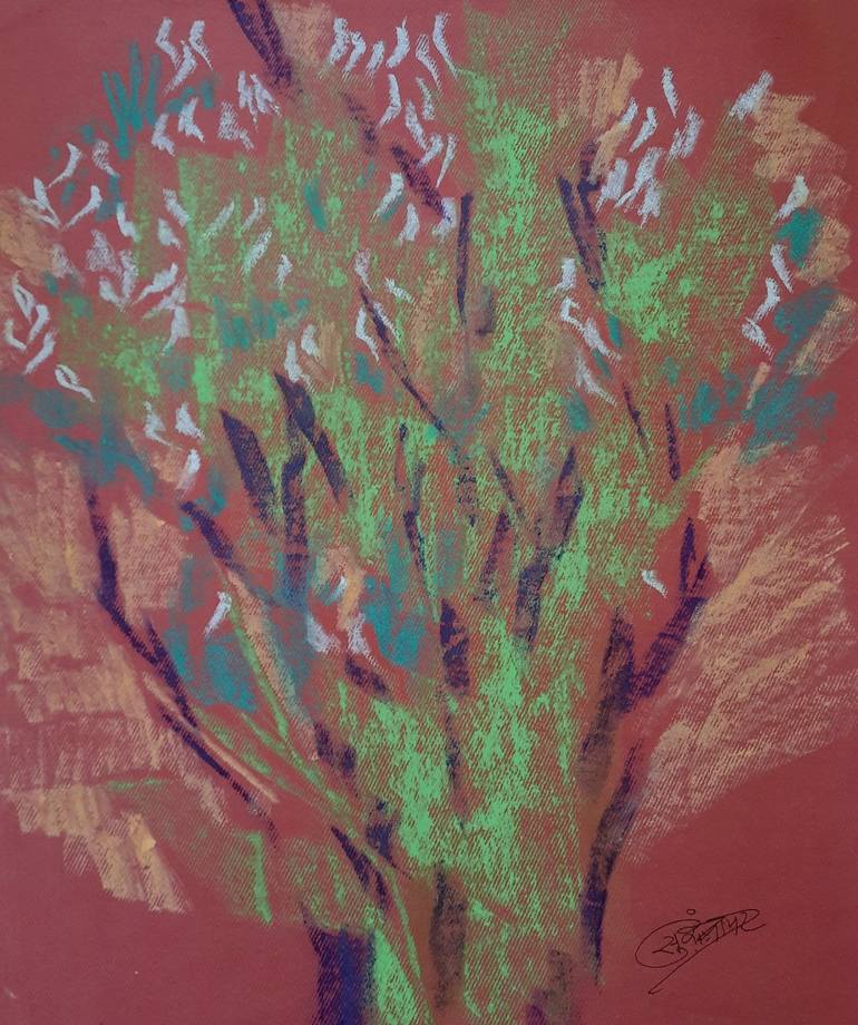 In hues of earth and whispers of green, A tree unfolds where dreams convene. Blossoms rise on branches wide, Dancing softly, side by side. Pastel strokes with grace imbue, A quiet bloom on canvas hue.