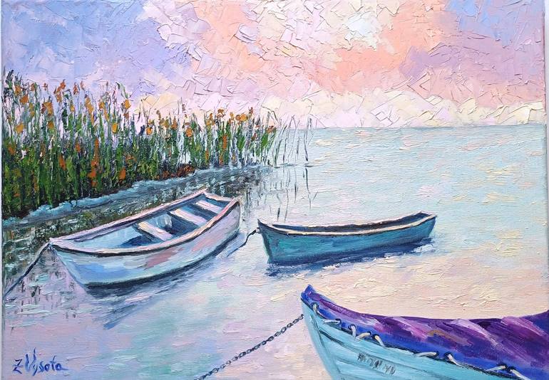 --- Pastel Sunset Colors. --- "Tranquil Waters at Dawn" This serene oil painting captures the stillness of dawn, with soft pink and blue hues stretching across the sky as the first light reflects on the calm water. The boats, gently tethered and waiting, suggest a moment of quiet contemplation bef...