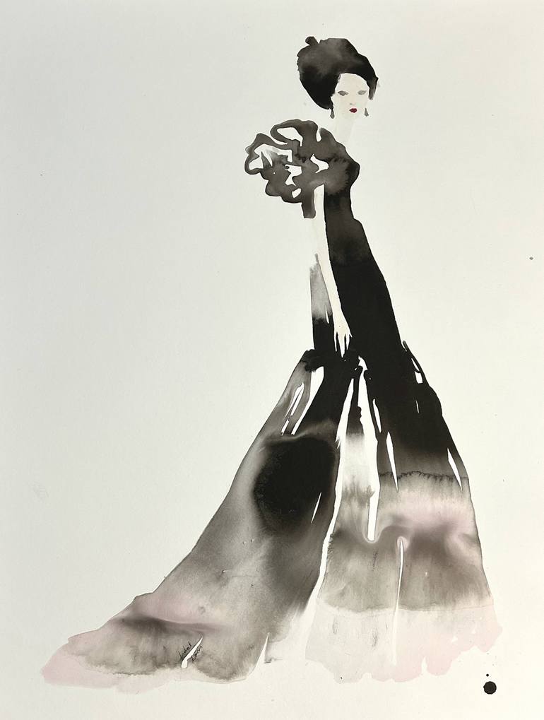 Exploring the theme of 'The Waiting Game,' this piece is part of a series delving into the concept of waiting, often imbued with a sense of romantic tension and anticipation. Ink and 23ct Red gold leaf on 400gsm watercolour paper. Unframed. Paper size: 57cm x 73cm Image size: 47cm x 67cm