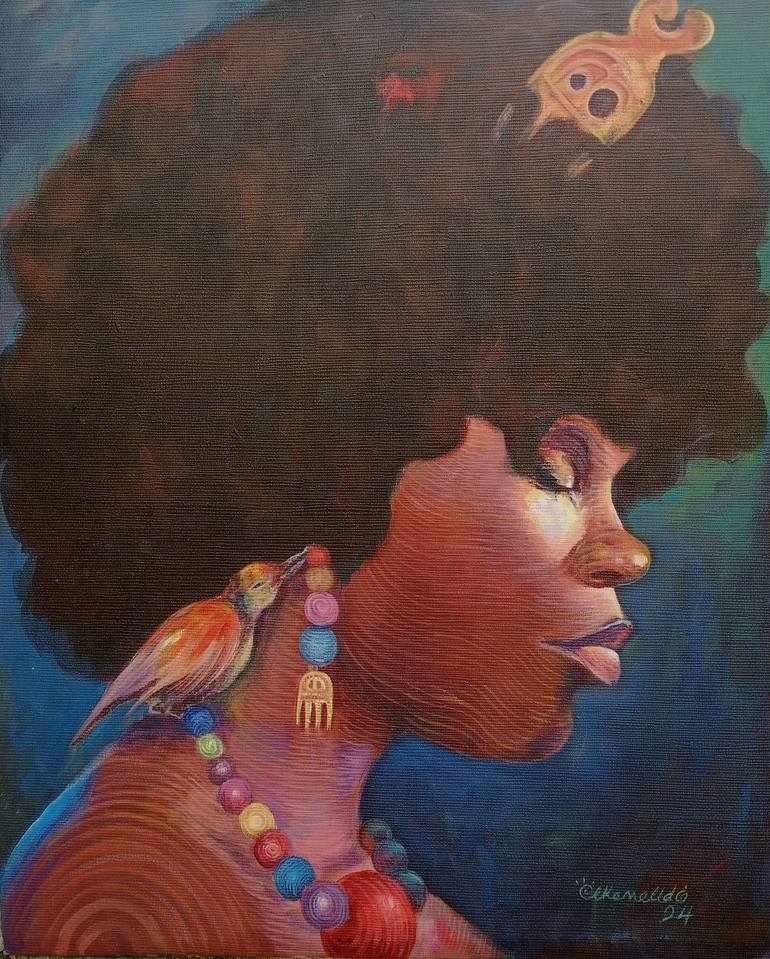 Ukeme Udo Ukeme Udo (b. 1989, Akwa Ibom, Nigeria) is a Nigerian painter whose expressionistic portraits and figurative compositions explore identity, culture, and the visual narratives of the African diaspora. Working from Ndon-Eyo in Onna L.G.A., his practice merges Western pictorial traditions with Afro-contemporary aesthetics, creating works defined by emotive brushwork, symbolic detail, and elaborate, dignified poses. Udo studied Fine and Industrial Arts at the University of Uyo, graduating with a B.A. in Painting in 2024. He completed his National Youth Service at the Nigerian Military School, Zaria, where he taught Cultural and Creative Arts. A full-time studio artist, he remains committed to expanding his technical and conceptual vocabulary through continuous experimentation. His work interrogates and reclaims cultural identity, challenging historical stereotypes while celebrating the richness, resilience, and beauty of African traditions. Through his bold visual language, Udo positions his art as an act of cultural affirmation and a form of visual redemption.