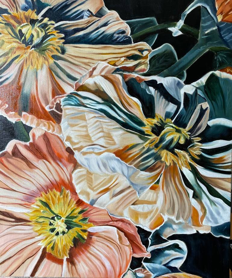 Painted in an unconventional palette of peach, burnt sienna, and blues, this artwork showcases three poppies in full bloom. The colours are rich and bold, capturing the essence of these captivating and delicate flowers. Peach Fuzz Poppies