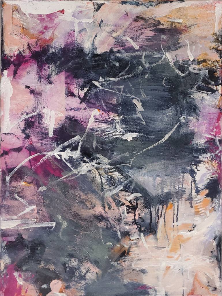 As an abstract painter I am interested in what happens in the world of a painting when serenity is invaded by a chaotic jumble of randomness. There is a moment, or a series of moments that are pivotal in the creation of a painting... perhaps the same can be said, in the creation or living of a life. In that spirit I am pouring, scraping and blotting paint, creating a kind of managed chaos. After the rush of adrenaline subsides, it is then my job to meditate on the results and work with them until the painting feels "right." I want the marks on the canvas to talk to each other, for the layers to interact, for the process of how the painting was built to be apparent.