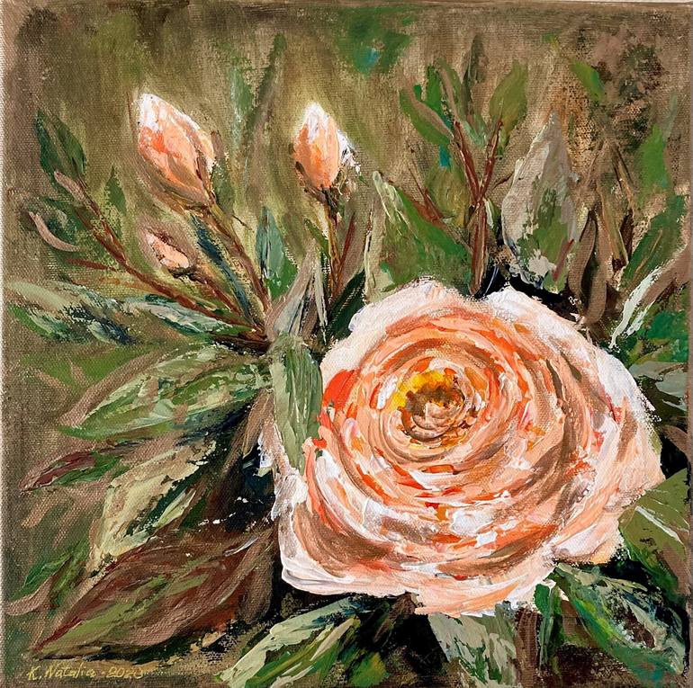 Roses from my garden inspired me to do this beautiful work .I added some gold paint to give the work a little antigue look. This lovely painting was done with a knife to create texture. Looks great with a yellow roses like a set.