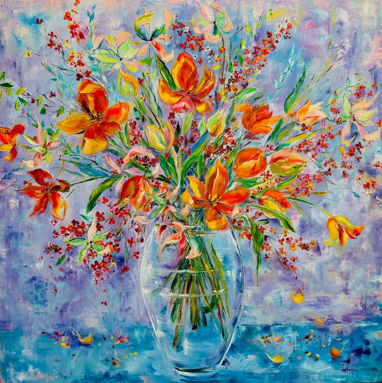 “ Peach tulips ” painting is an original oil painting on canvas with palette knife. This painting looks great in the interior with deep saturated colors, volume and many small details that add sophistication and subtleties to the composition. The flowers look mysterious and originally. ABOUT THIS P...
