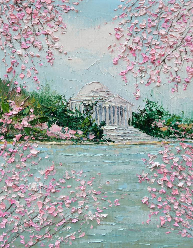 Heavily textured spring landscape of the cherry blossoms on the Tidal Basin in Washington, DC. Edges painted to match. Wired and ready for hanging or framing.