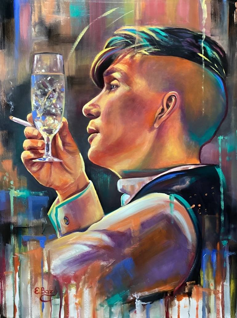 This portrait of Tommy Shelby from series " Peaky Blinders" is striking and intense, capturing his sharp features and commanding presence, yet in a relaxing pose with a glass of champagne in his hand. In this artwork, I sought to capture the complexity of human introspection and celebration. The sub...