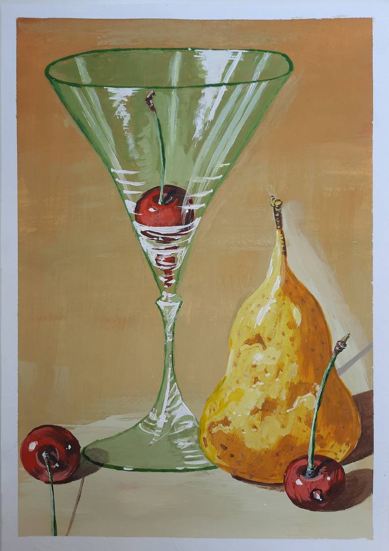 By Javier Mulio. Still life with a glass and pear. Bright and colorful picture, but with pastel tones. All of this combines to create a soft, calm atmosphere so that viewers can enjoy a simple and beautiful subject.